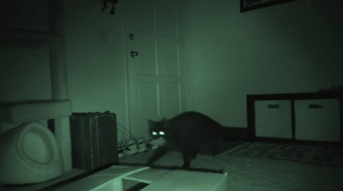 家の中に暗視カメラを設置して、猫が深夜に何をしているかを撮影した動画。