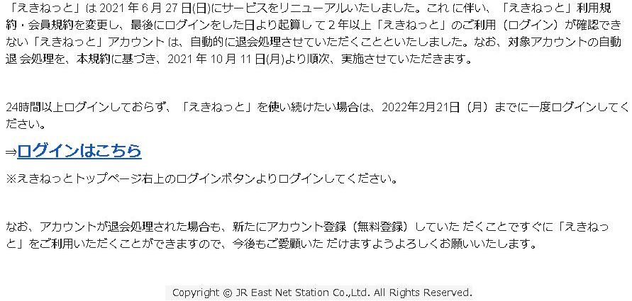 「えきねっと」は 2021 年 6 月 27 日(日)にサービスをリニューアルいたしました。これ に伴い、「えきねっと」利用規約・会員規約を変更し、最後にログインをした日より起算し て2年以上「えきねっと」のご利用(ログイン)が確認できない「えきねっと」アカウント は、自動的に退会処理させていただくことといたしました。なお、対象アカウントの自動退 会処理を、本規約に基づき、2021 年 10 月 11 日(月)より順次、実施させていただきます。